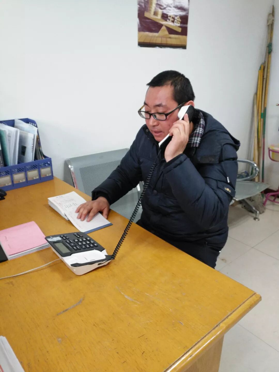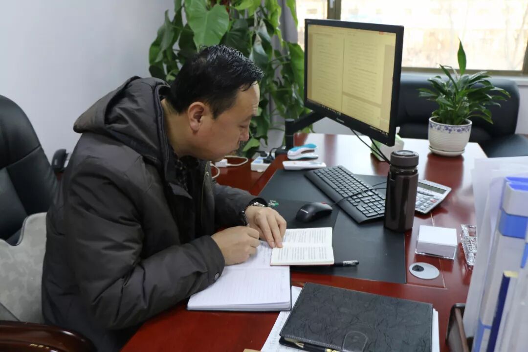 平罗水务公司副总经理李军带班值守,正在办公室学习并记录笔记。