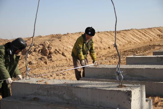 宁工局公司员工杨勇强在盐环定3泵站工地一边指挥工人吊装混凝土预制支墩,一边用卷尺校核安装位置。杨勇强说:“只有每个尺寸距离都精益求精,才能干出精品工程,宁工局的品牌就是这样打造的”。