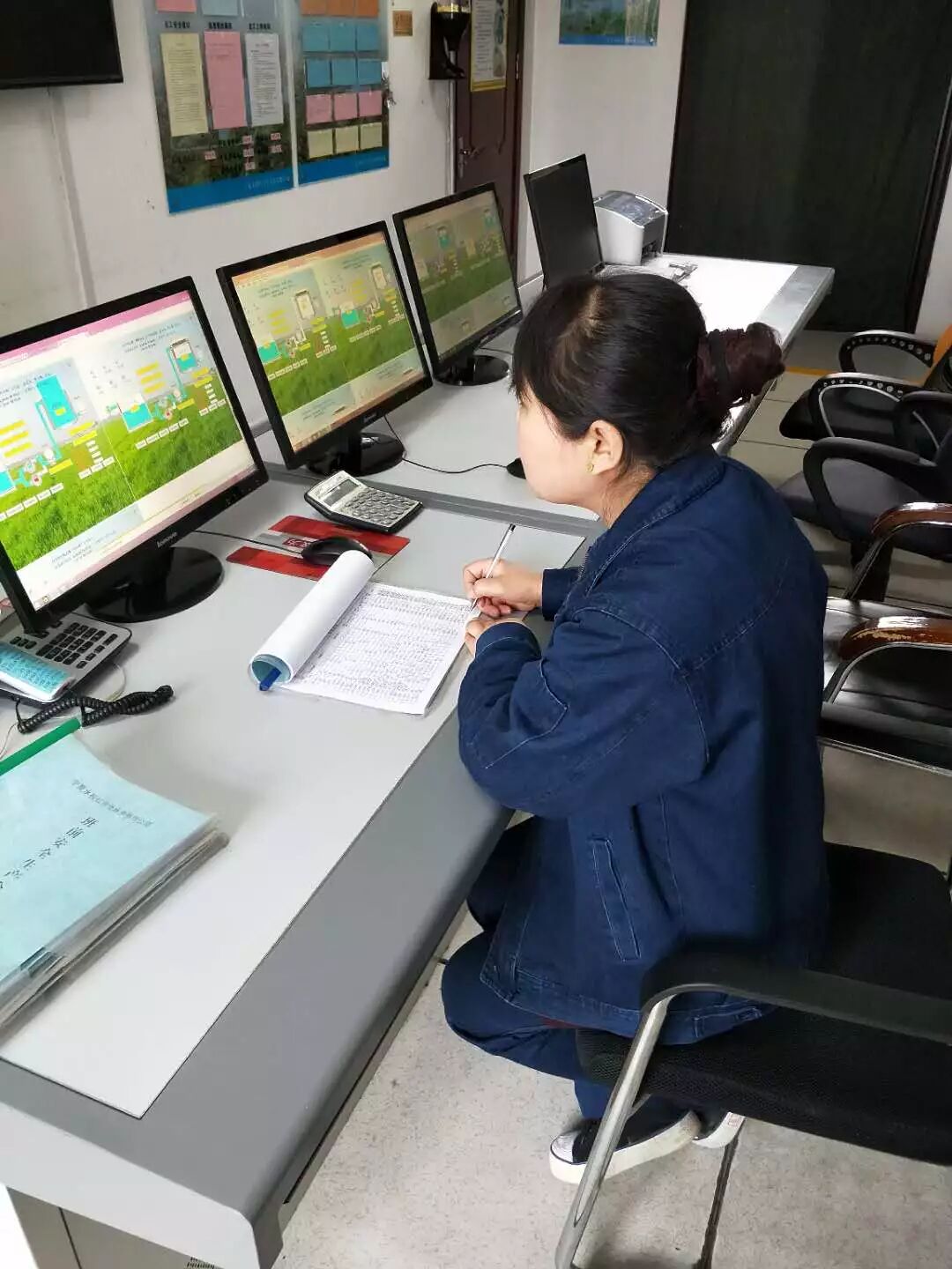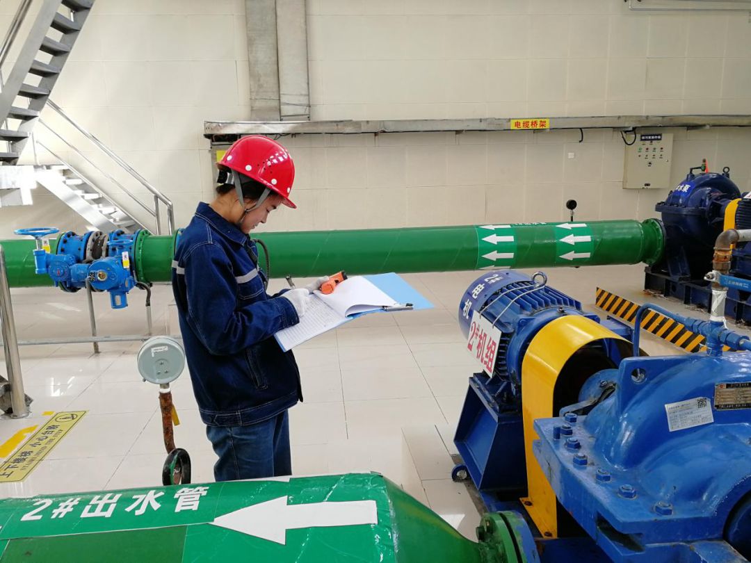 太阳山水务金积供水分公司运行值班员刘红霞,正在对设备机组、配电柜进行巡视并记录设备参数,确保设备正常运行。