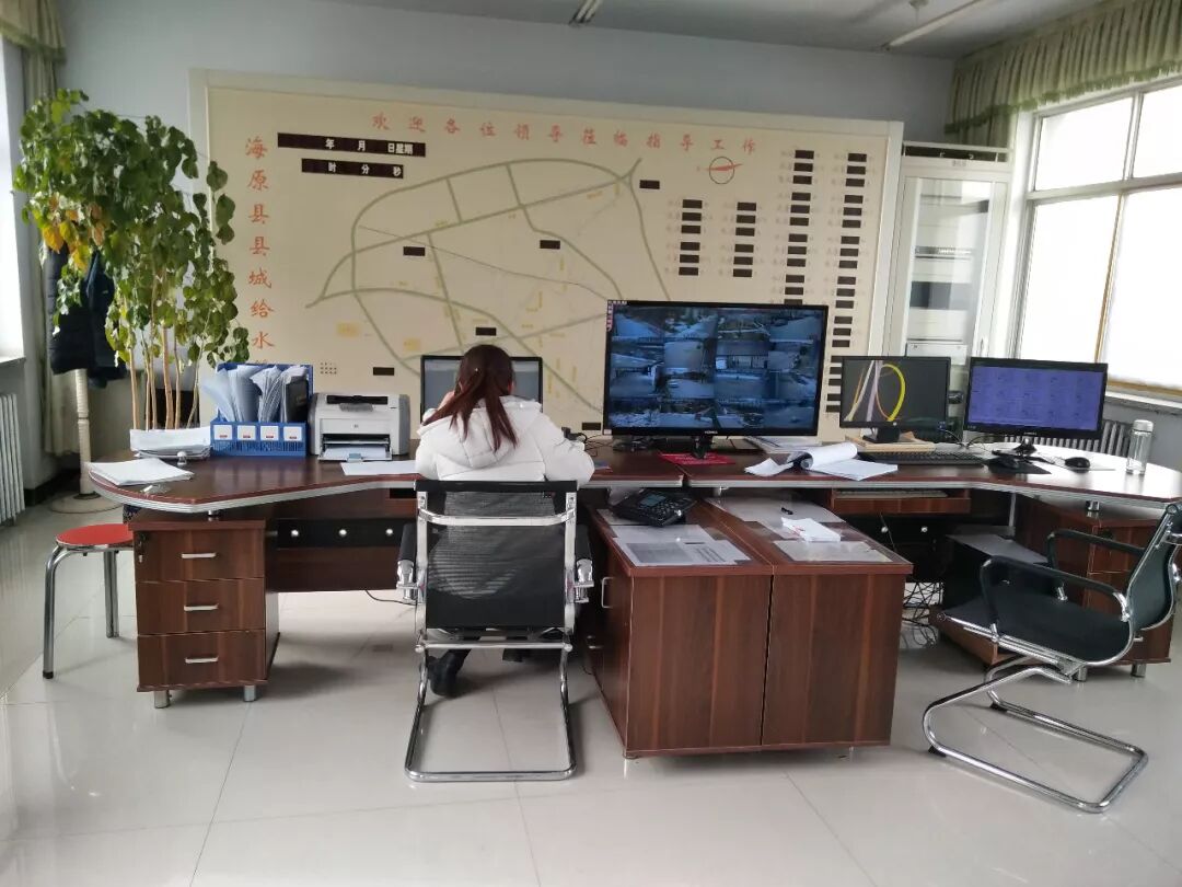 中宁水务公司调度中心全体成员对着电脑在认真研究供水调度工作。