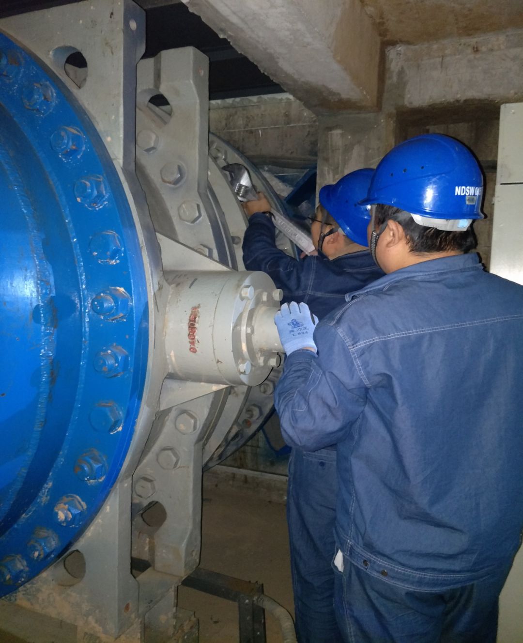 宁东水务公司水源泵站余佳蔚等人,正在对水泵层管道伸缩节进行检查并紧固。