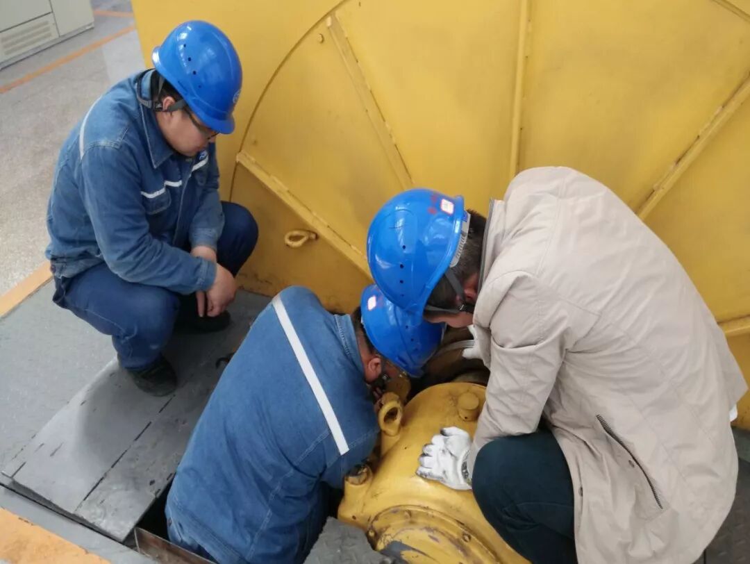 宁东水务公司红山石泵站马旭等人,正与检修人员对电机集电环进行调整,保证设备安全运行。