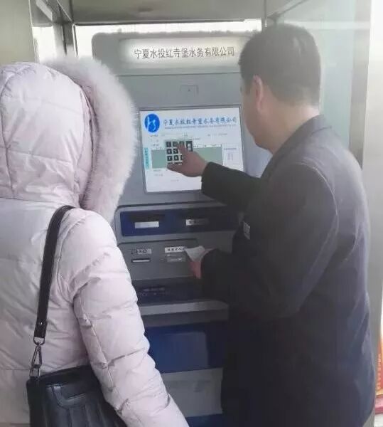 红寺堡水务公司吴艳敏帮助用户自助缴费机缴费。