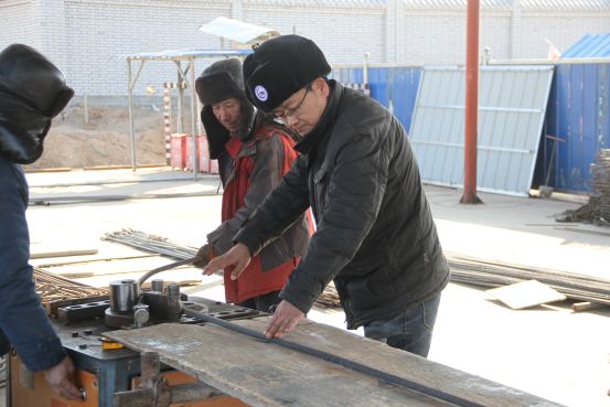 宁工局公司员工孙卫建在盐环定3泵站工地指导工人制作钢筋,确保每根钢筋都准确无误。