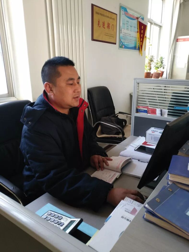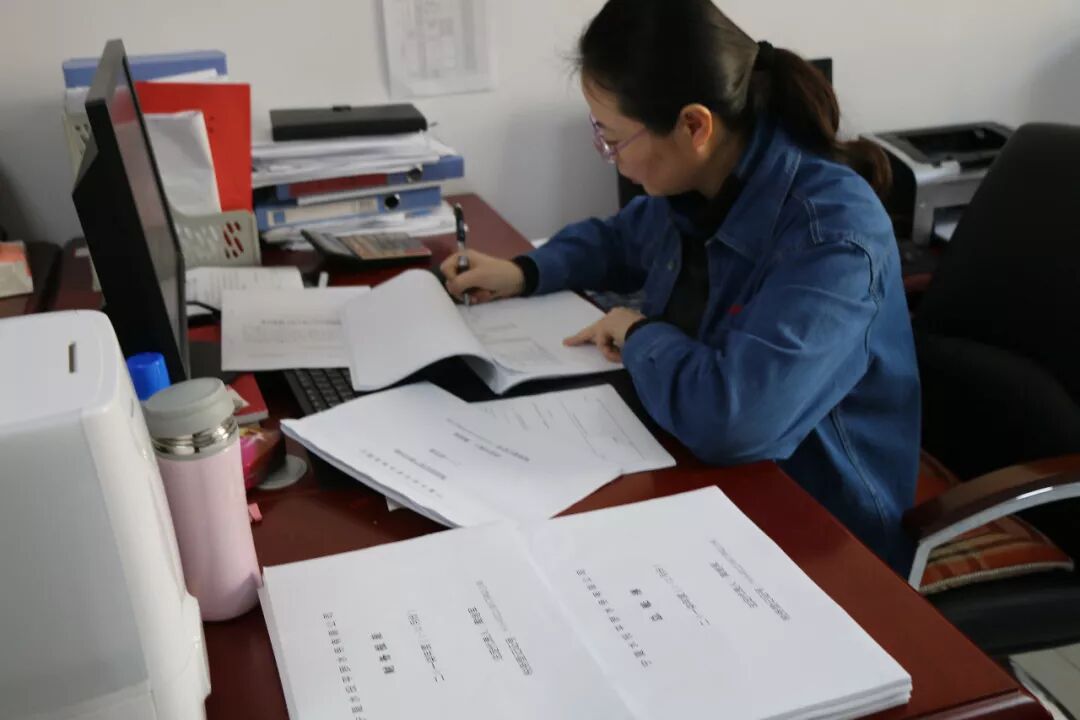 平罗水务公司罗双琴值班期间,在办公室梳理、核对2017年度各类账本。