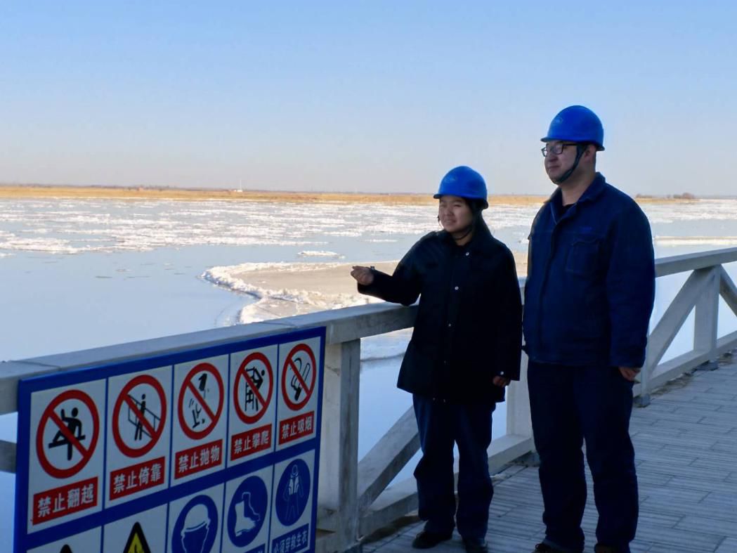 宁东水务公司水源泵站值班长徐海英和沈冬,正在对泵站黄河冰凌情况进行查看。